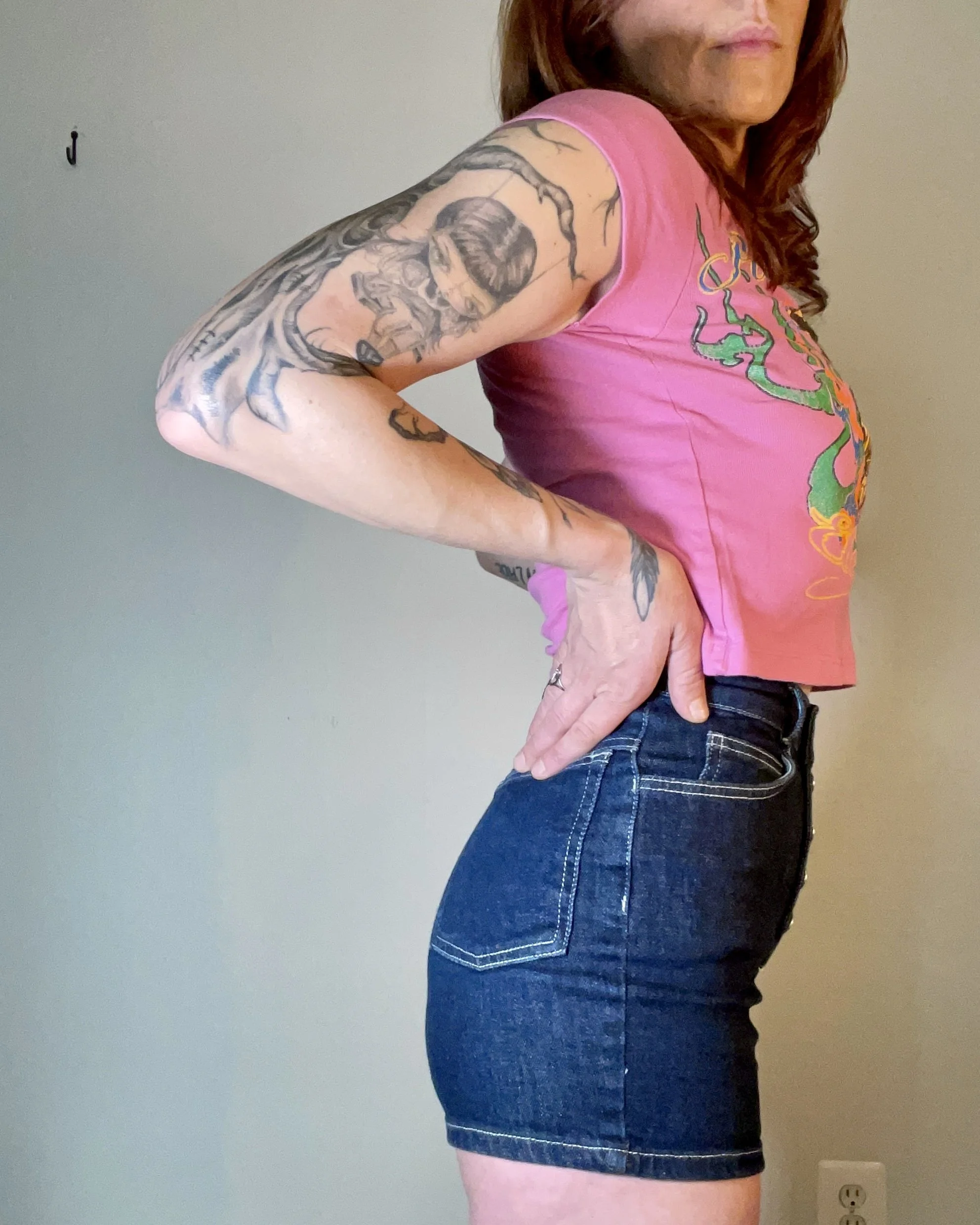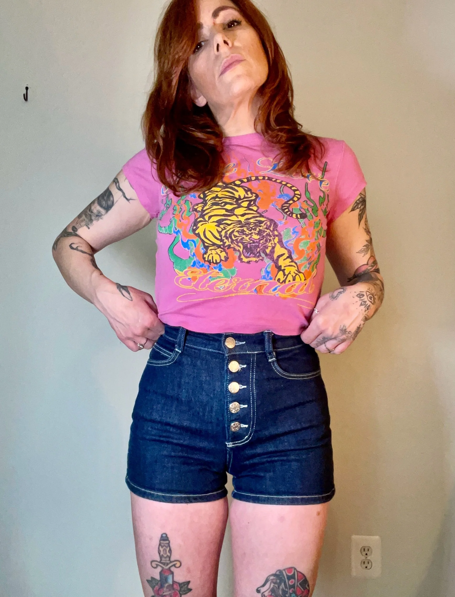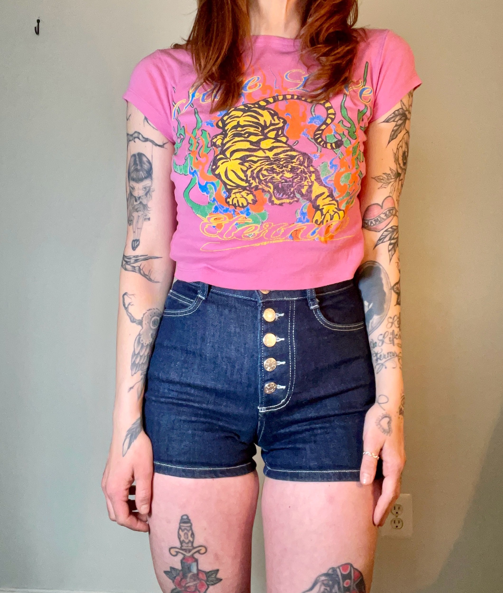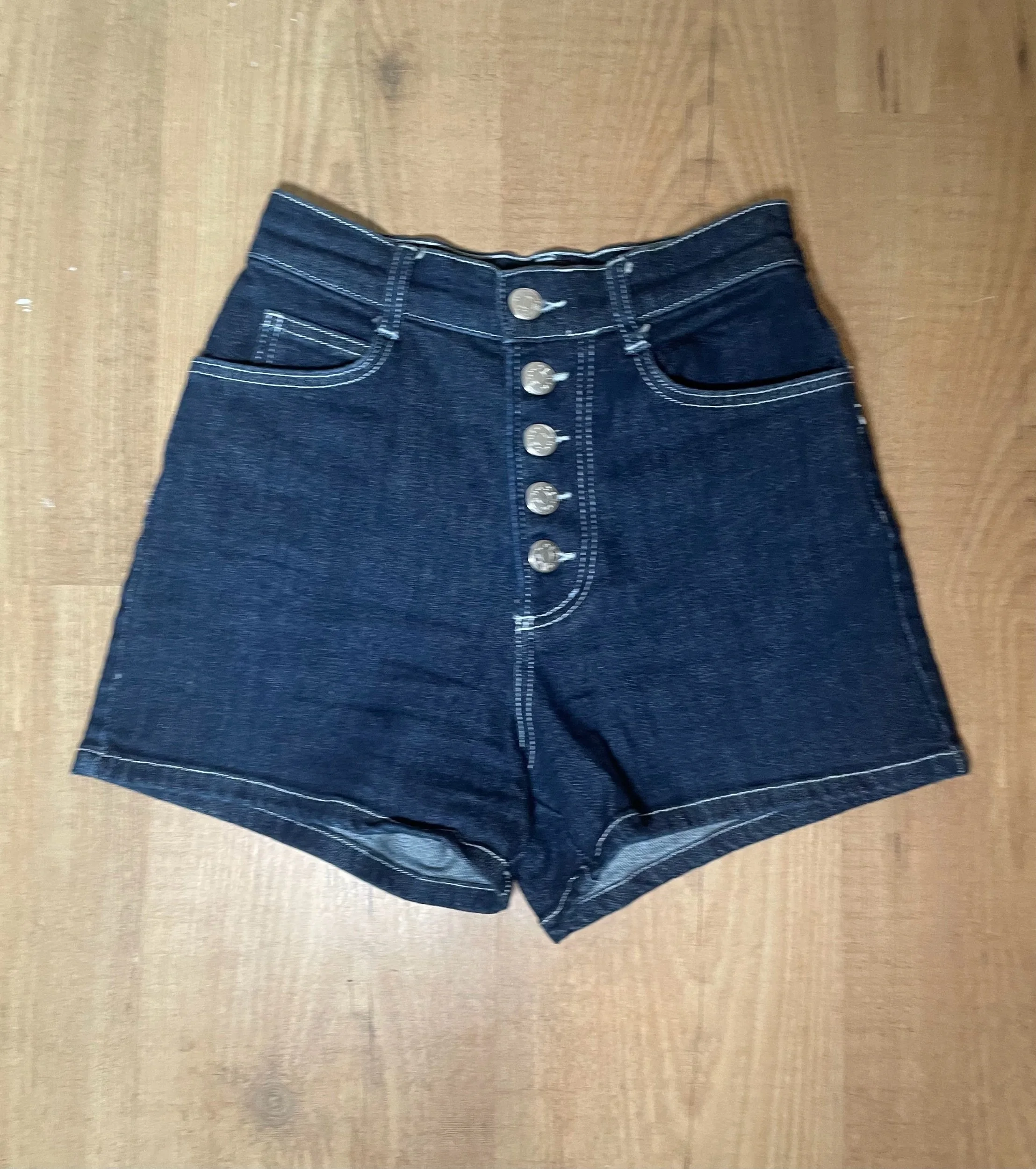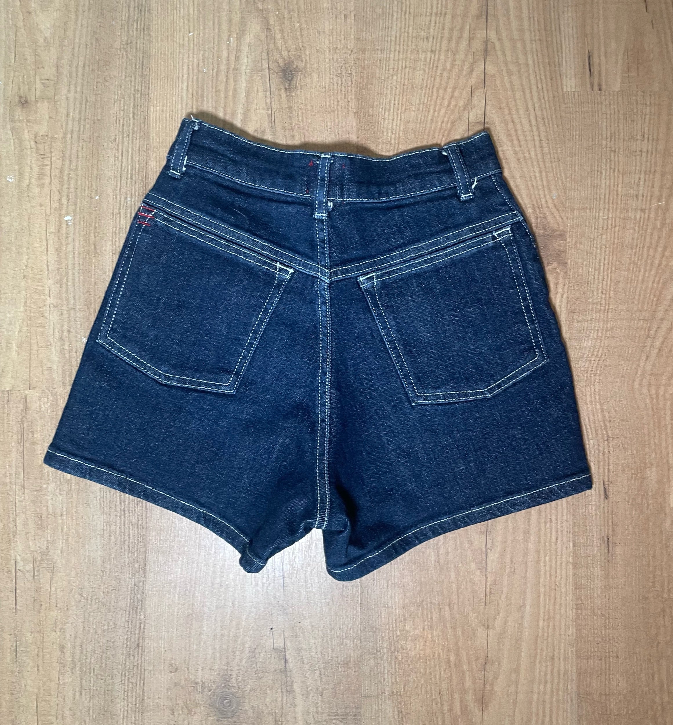 BDG high rise button fly shorts. Dark wash denim with contrast stitching. 99% cotton, 1% elastane. Size 24.