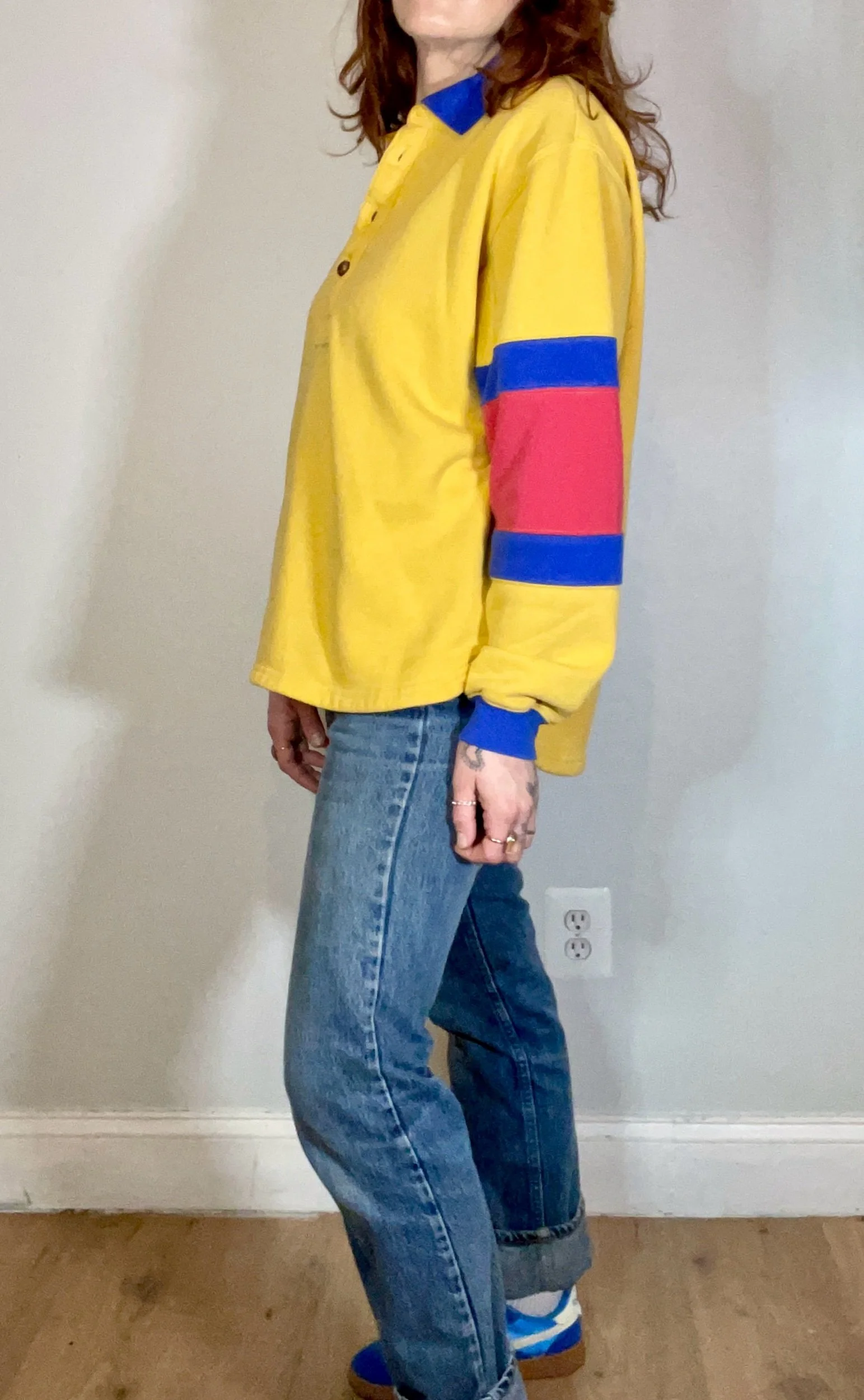 BDG rugby sweatshirt. Quarter button up and shirt tail hemline. Super soft and cozy. Poly/cotton blend.
