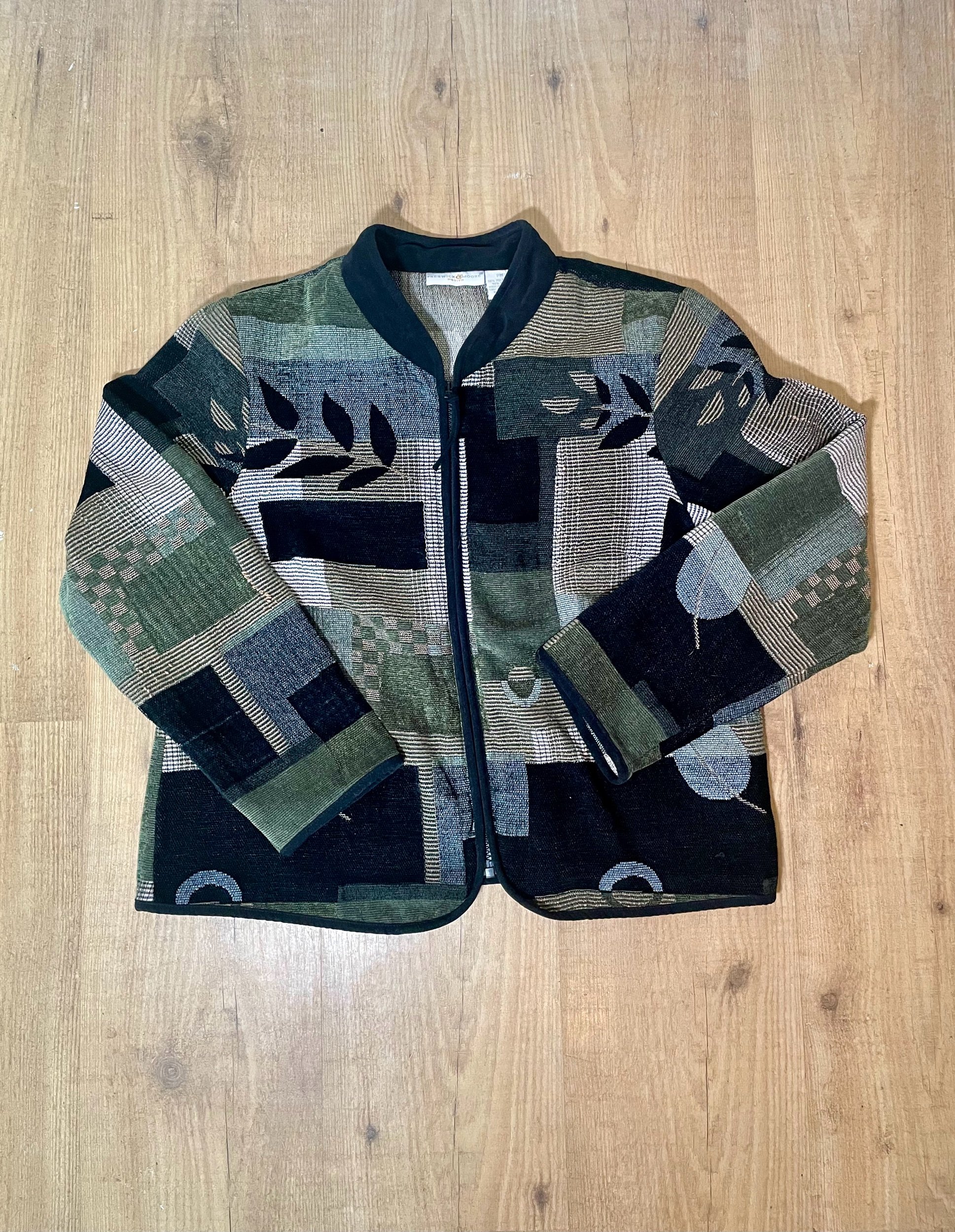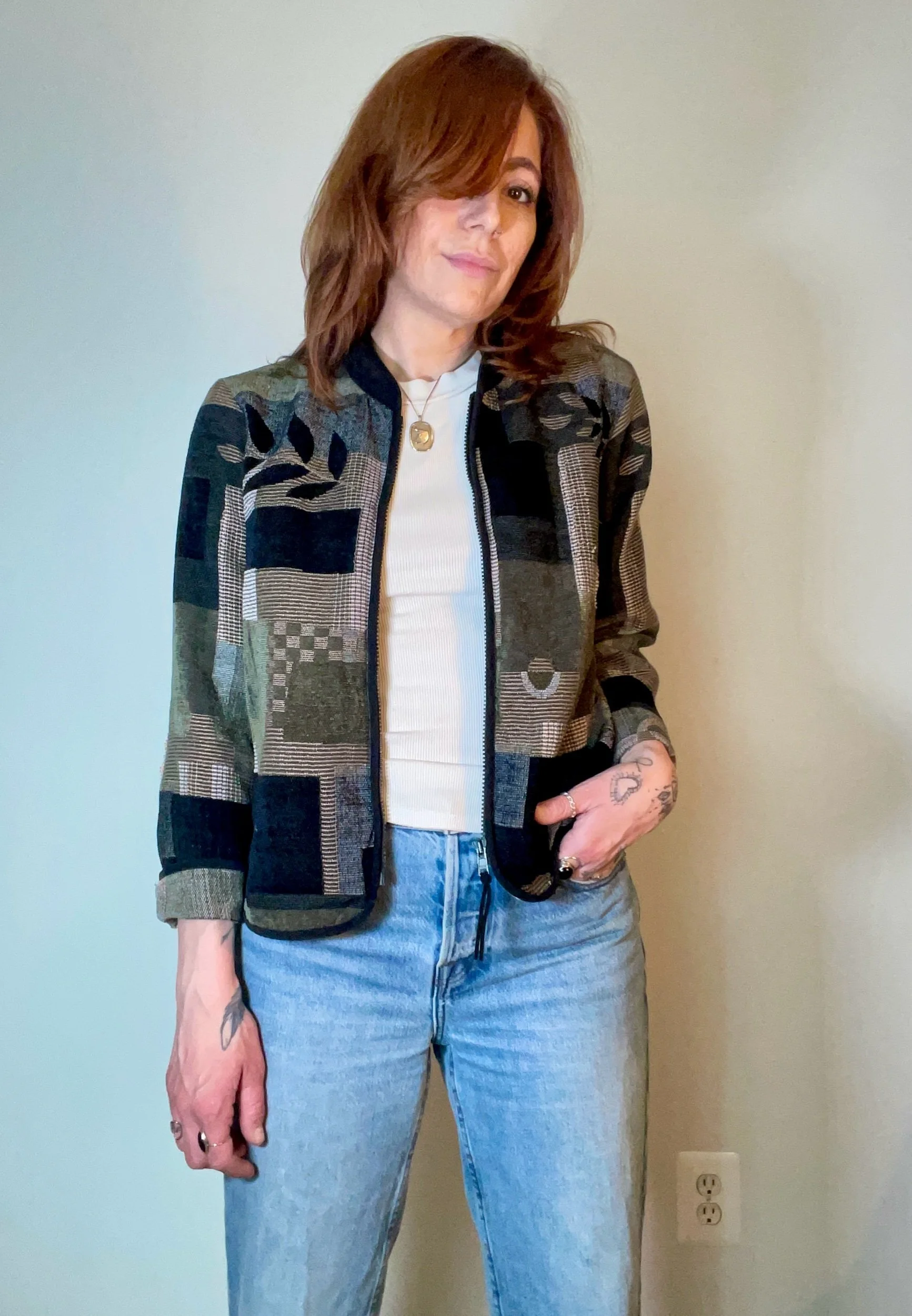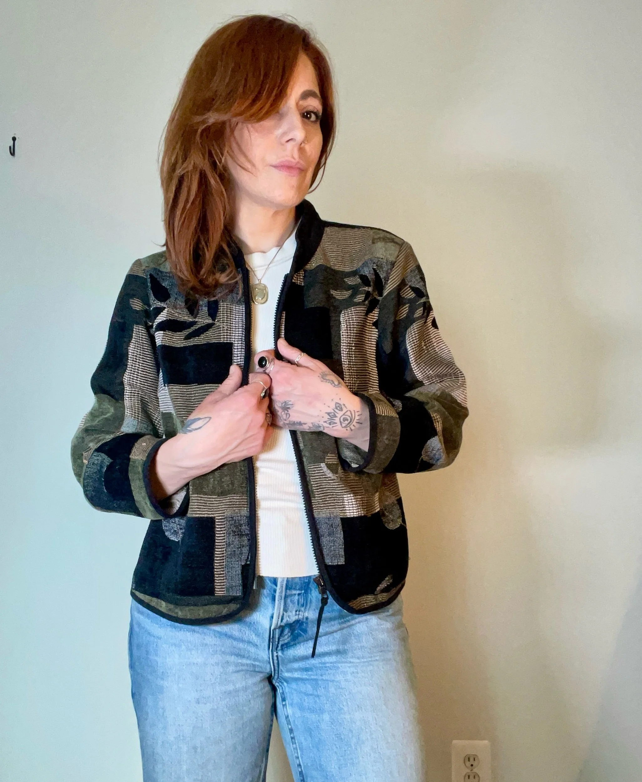 Cropped tapestry jacket with mandarin collar and zipper closure. Cute boxy silhouette with 90’s geometric print.