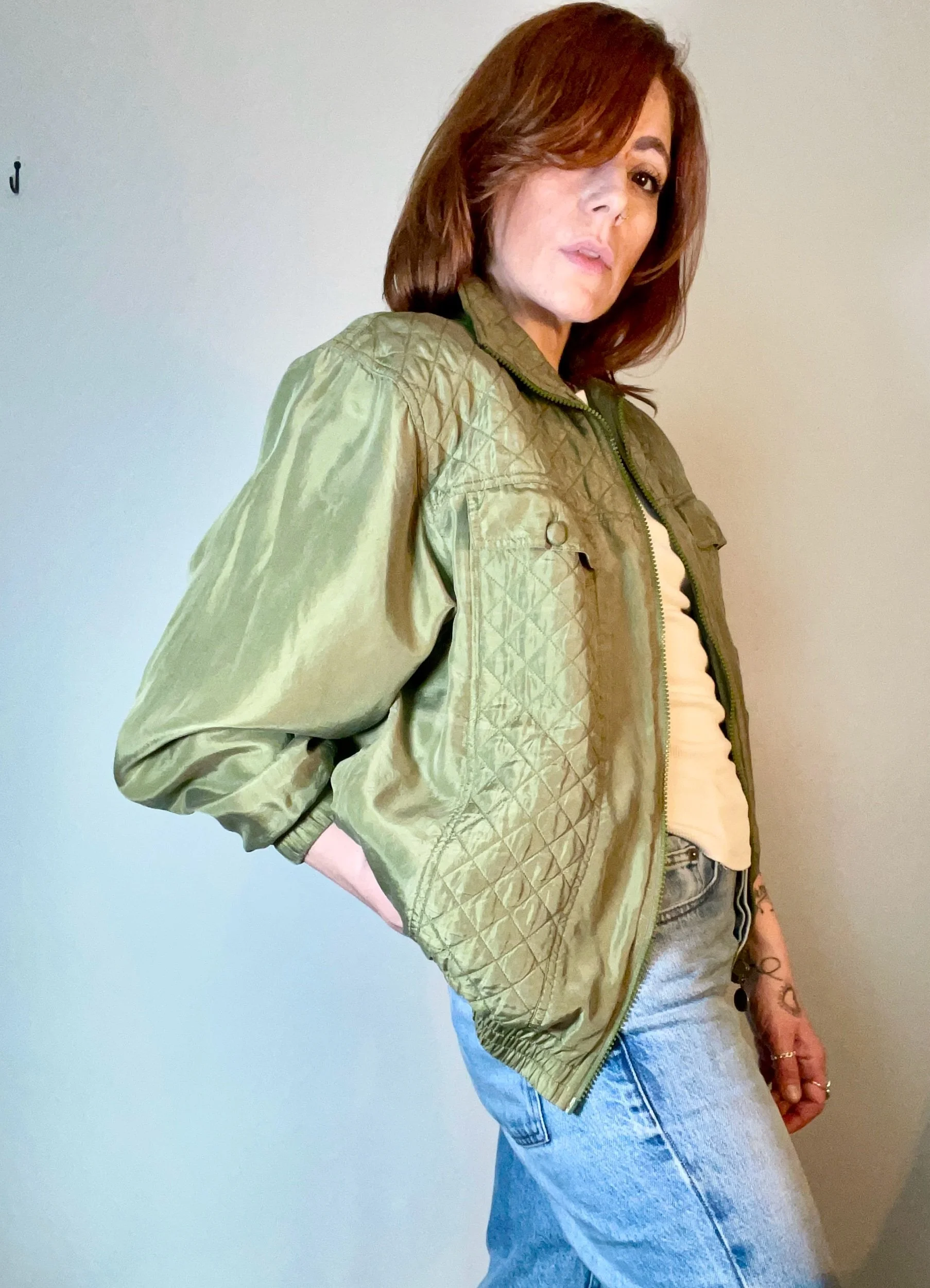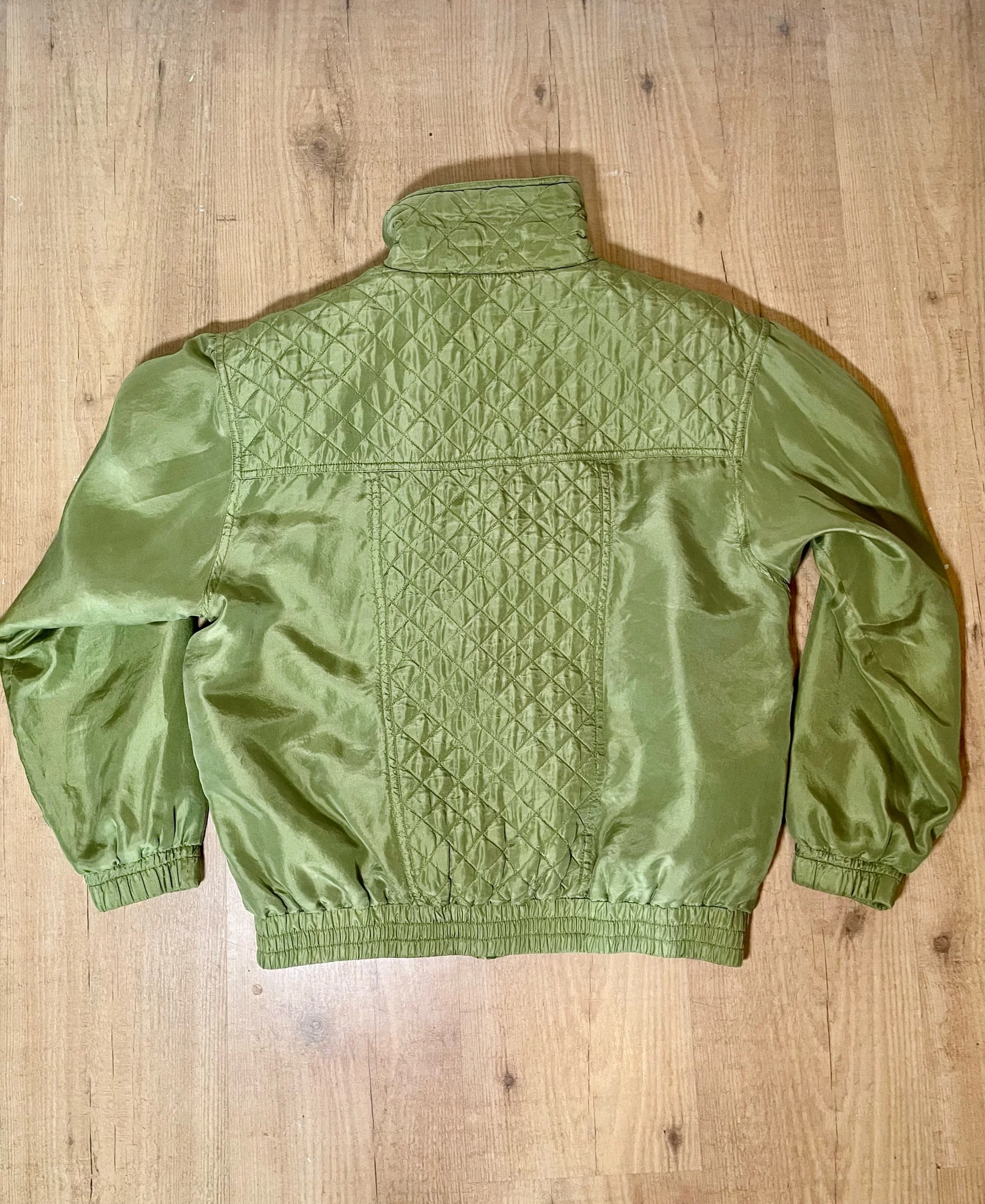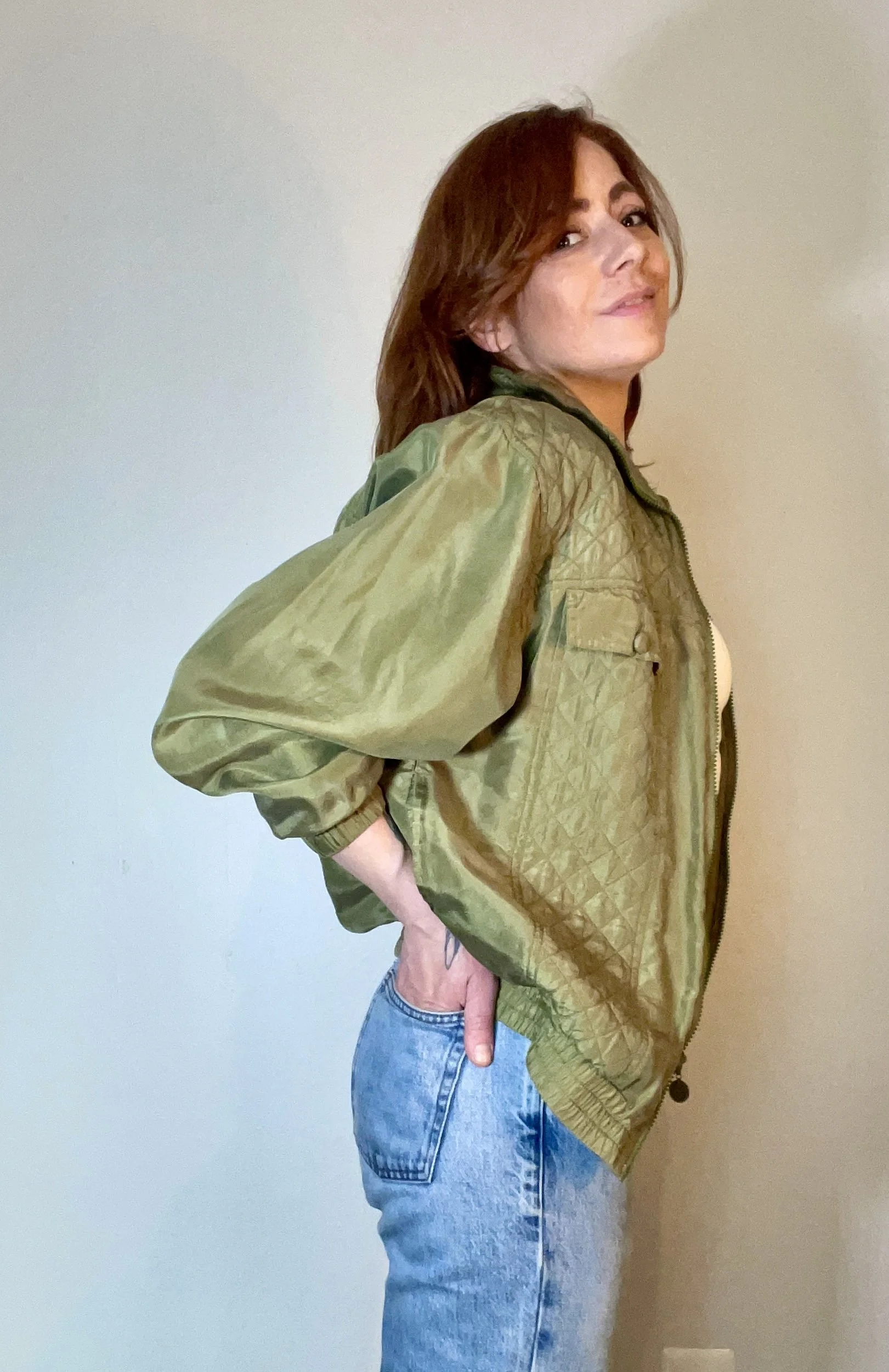 Quilted silk bomber in olive green. Great transitional layering piece complete with shoulder pads. Labeled size small, but fits more like a medium. 100% silk.