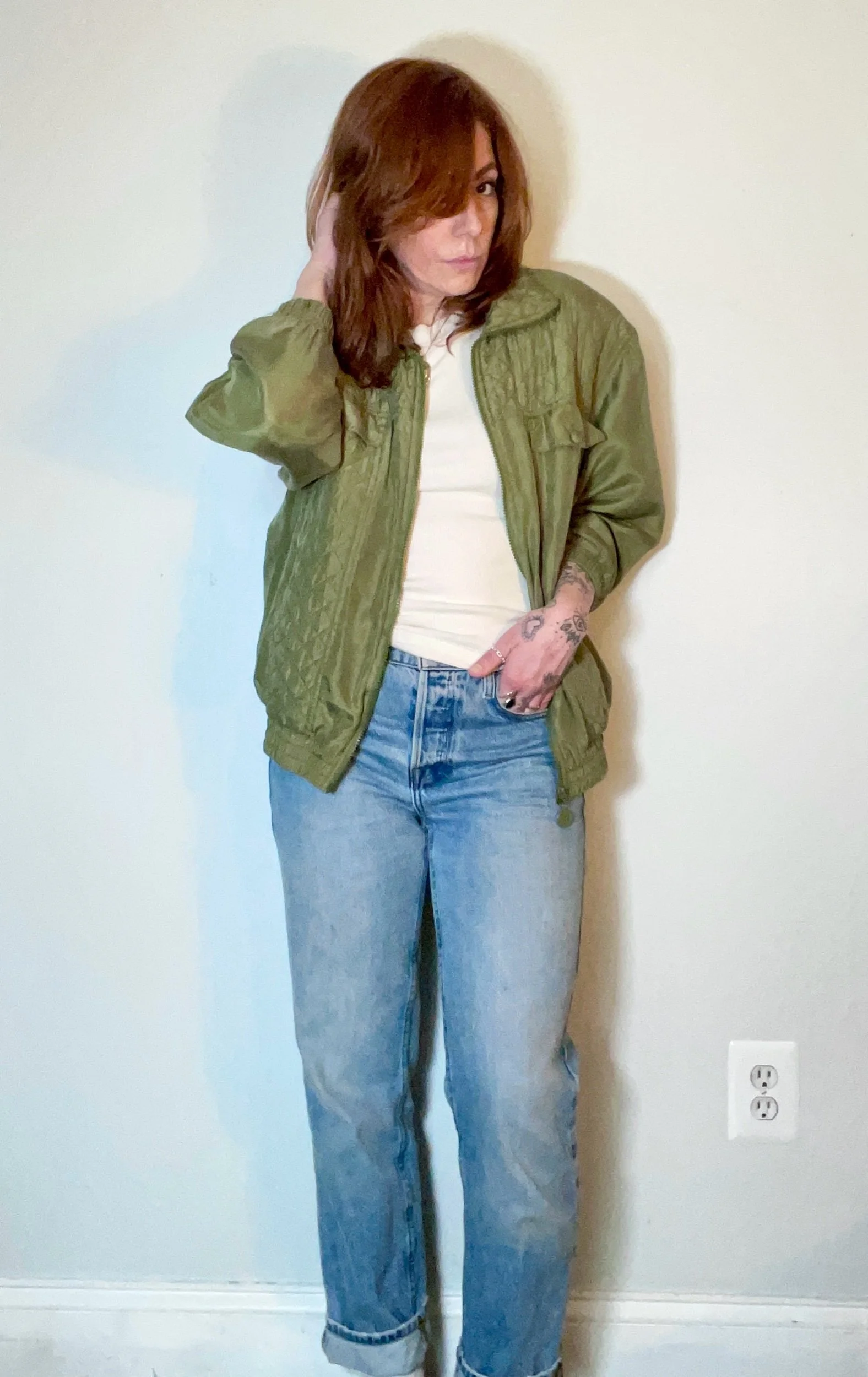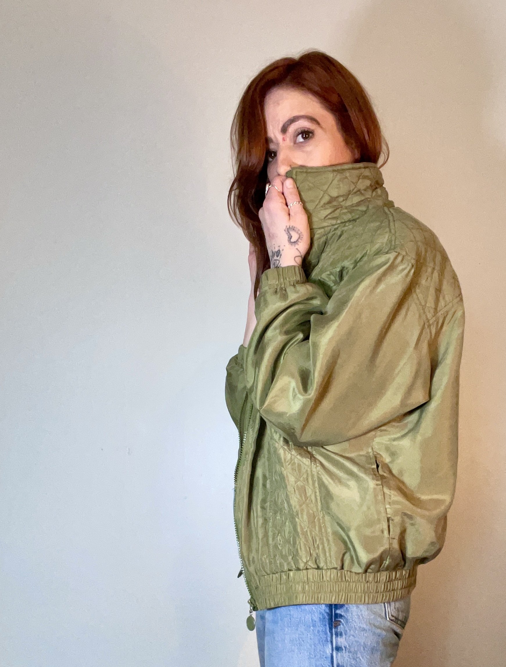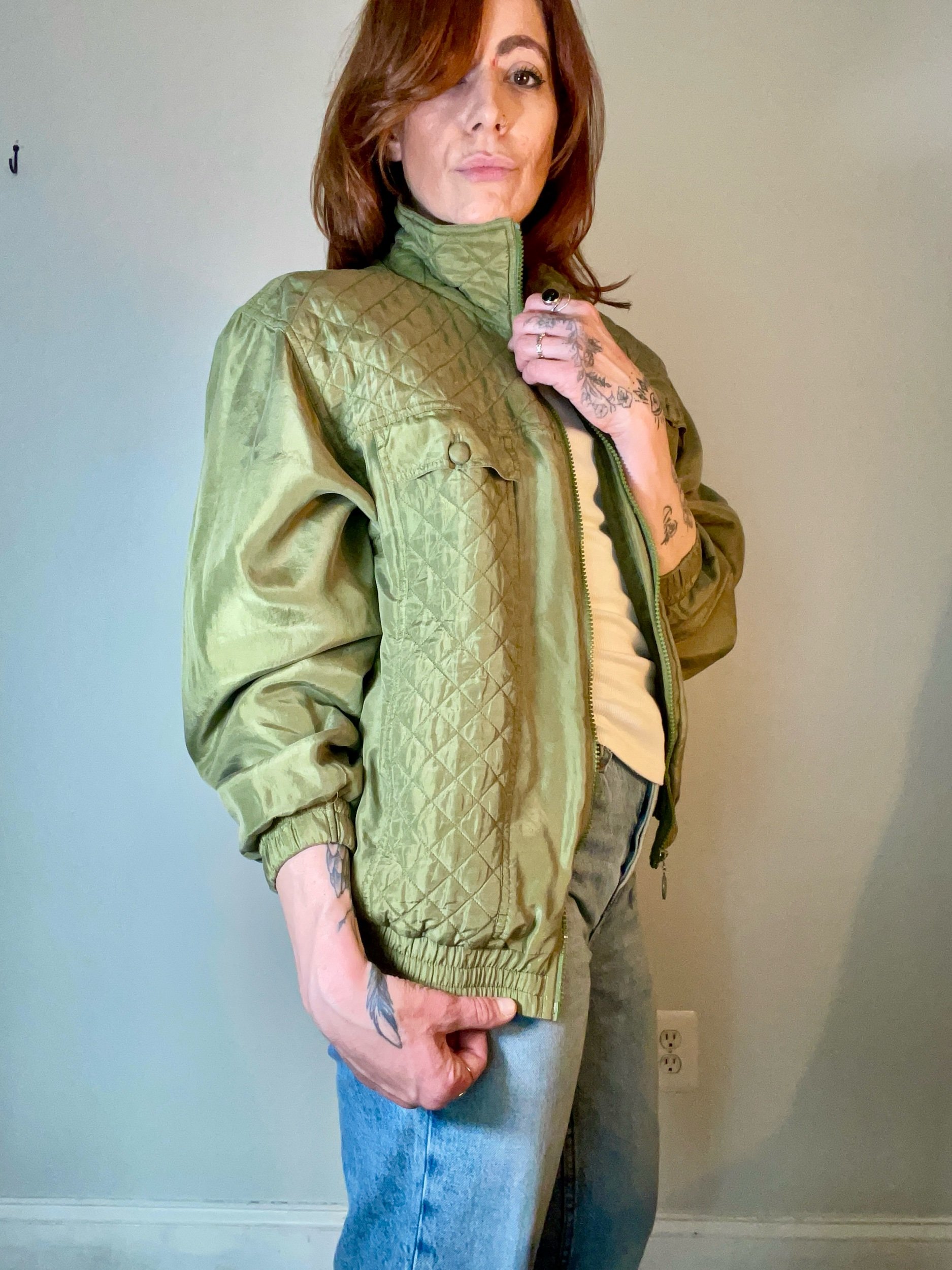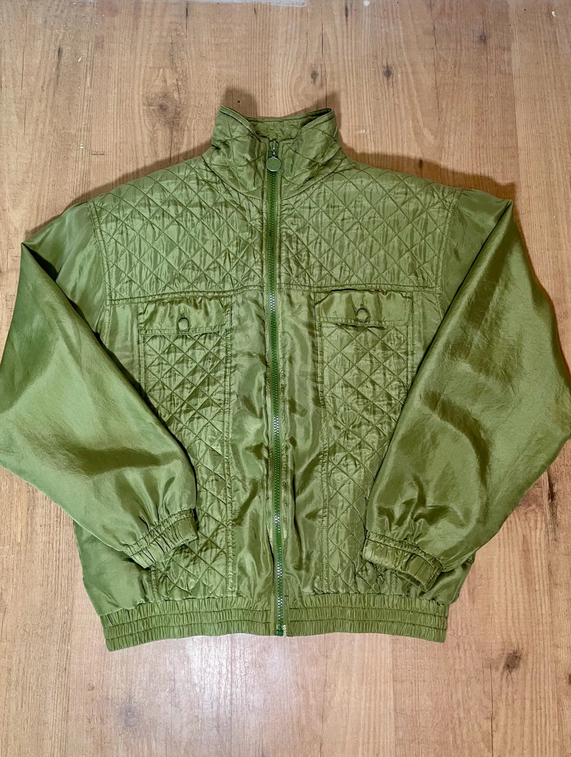 Quilted silk bomber in olive green. Great transitional layering piece complete with shoulder pads. Labeled size small, but fits more like a medium. 100% silk.